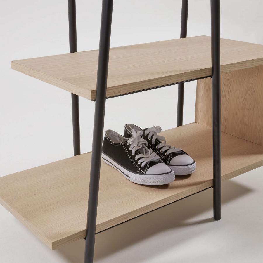 Attaccapanni con specchio rotondo e struttura in metallo nero. Mensole in MDF quercia