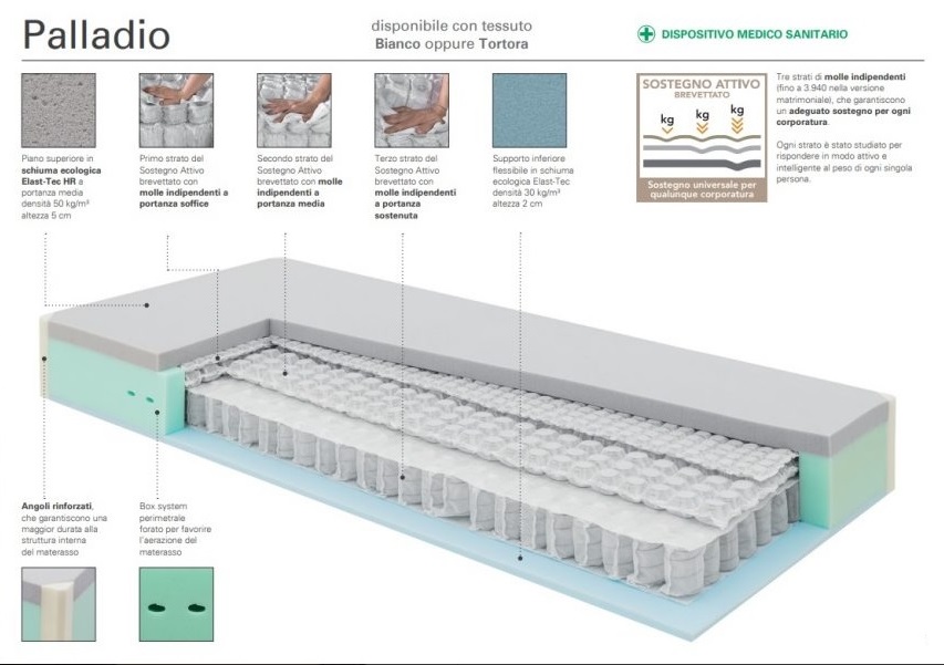 Materasso a molle indipendenti con Sostegno Attivo brevettato che garantisce un adeguato sostegno per ogni corporatura.